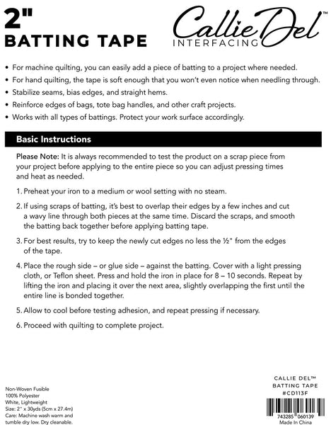 The 2” batting tape from Callie Del is the perfect solution for joining two or more pieces of batting together on your larger quilts. This lightweight stabilizer won’t gum up your machine, or add bulk to your project.