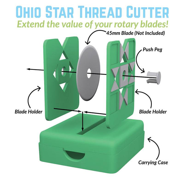 Extend the value of your rotary blade by using the Ohio Star Thread Cutter. Place your used rotary blades in the cutter, add in the center push peg, and place in the base. The Ohio Star Thread Cutter folds up to fit in its carrying case to take to your next class or retreat. No tools required.