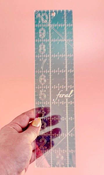 Our most popular sized ruler! 2.5 by 10 inch quilting ruler. Markings are every 1/8 inch, with a diagonal line at 45 degrees on either end for easy half square triangle trimming. This is a great size for trimming quilt binding! Laser cut and engraved from 1/8 inch acrylic. The markings are engraved so they'll never rub off. Non-slip dots provided with every ruler.