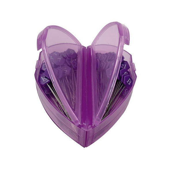 104 hexagon shaped pins come in a reusable storage box. Numbered (0-25) on one side and lettered (A-Z) on the other. .5mm thick, and the pinheads are heat resistant up to 350 degrees.