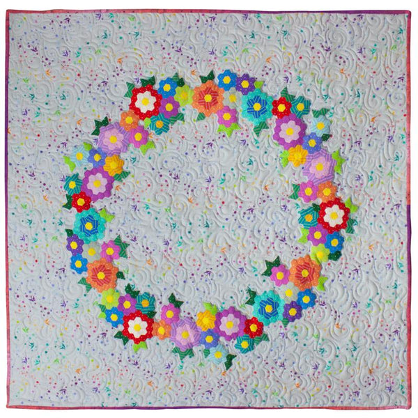 Vibrant blooms form an eye-catching wreath in the center of this wall-hanging sized quilt. Made using two charm packs from Tula Pink’s “Tiny Dots and Stripes” basic line, this miniature version of “Homage to Grandmother’s Flower Garden” removes the pieced background, making this a quick project to stitch together! Create a new heirloom with a stunning floral wreath using the ever-popular hexagon shape and jewel-shaped leaves.