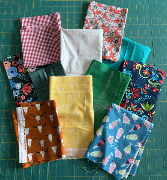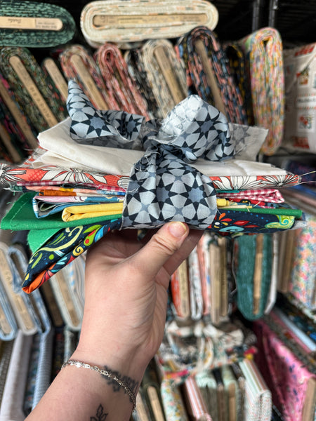 1 pound (3 yard equivalent by weight) bags of various brands of fabric (Moda, Tilda, Art Gallery Fabrics, Riley Blake, Heather Ross, Andover, Cotton + Steel, Ruby Star Society, etc.). These will be from multiple lines/brands/designers and totally random in size and print. The photo is an example only, you will not get the exact fabrics as the photo. These are bolt ends so the cuts may be uneven but there is still a lot of usable fabric. Pieces will be full WOF but will range in length from 2" to just under 18" or fat quarters. No repeats of prints within the same bag.