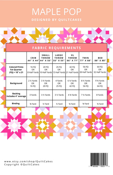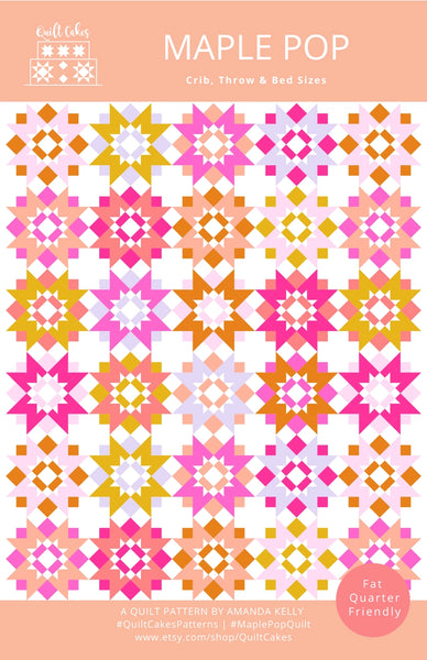 The Maple Pop Quilt is a mix and match quilt pattern that allows for fussy cuts and the use of your favorite fat quarter bundle. Maple Pop offers six sizes. Blocks finish at a 11". Skill Level: Adventurous Beginner Skills Include: Snowball technique, trimming on the bias, and squaring blocks. A consistent 1/4" seam allowance is necessary. Pattern assumes that the quilter has basic piecing and quilting knowledge.
