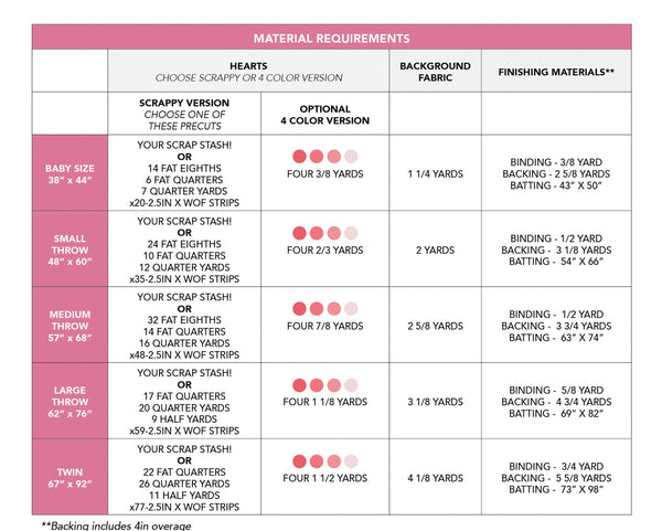 This sweet and simple heart quilt is scrap and stash friendly! Use your scrap stash, fat quarters, fat eighths, jelly roll strips or 1/4 yards. * Includes 5 size options: Baby (38" x 44") Small throw (48" x 60") Medium throw (57" x 68") Large throw (62" x 76") Twin size (67" x 92")