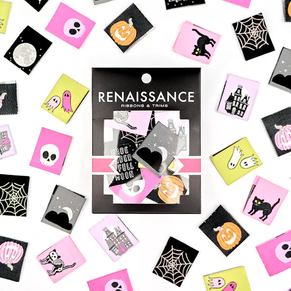 When the moon is full and the shadows dance, the Spooky Night woven label pack comes alive! This hauntingly fun collection features 8 eerie designs, including glow-in-the-dark favorites like a curious black cat, a moonlit starry sky, and delicate spider webs. But that’s not all—there’s also a haunted house, floating ghosts, a glowing full moon, and more to add a touch of frightful charm to your handmade projects. Perfect for Halloween stitching or anyone who loves a little spooky magic, these double-sided, center-fold labels are a glowing reminder that even the creepiest creations can be boo-tifully made.