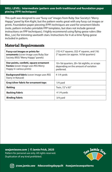 This quilt is designed to use "fussy cut" images from Ruby Star Society's "Merry Happy" panel by Kim Kight (to be release in 2026), but the pattern works great with any fussy cut images or prints. Foundation paper piecing (FPP) techniques are used for the ornament blocks (note, pattern includes printable FPP templates, but does not include general instructions on FPP techniques). I highly recommend using flying geese rulers (like Bloc_Loc) for trimming sawtooth stars. Instructions for making 4-at-a-time flying geese are included in pattern.