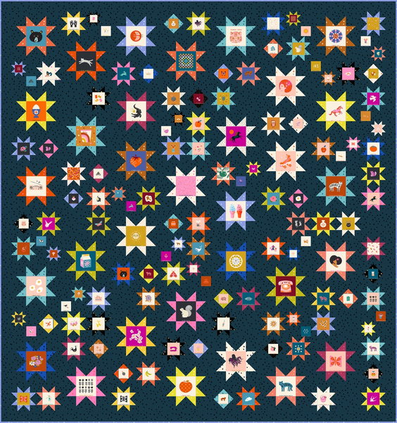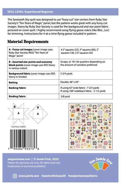 My Sawtooth Sky quilt pattern uses fussy cut star centers from the Ruby Star Society “Ten Years of Magic” panel. My test quilt shown also uses fussy cut centers from other RSS collections. Background and star point fabric pictured is RSS Starry. The finished quilt is a large throw size, 79” x “84”. Coloring page now available at PreQuilt.com.