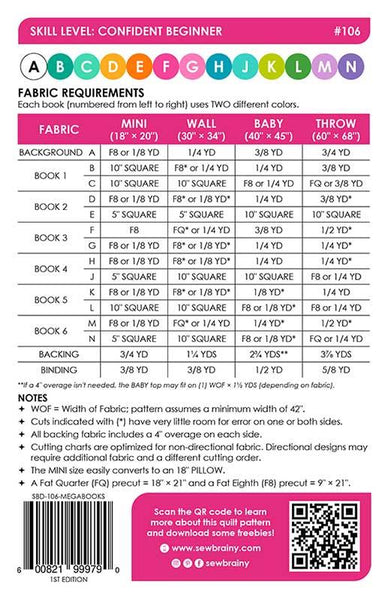 The Mega Books quilt pattern by Jamie Siel of Sew Brainy Designs is a traditionally pieced modern quilt pattern that is perfect for the confident beginner. It is a scaled design (all sizes have the same layout) that comes in 4 sizes: Mini (18" x 20"), Wall (30" x 34"), Baby (40" x 45"), and Throw (60" x 68"). This printed pattern is formatted as a saddle stitch booklet (5.5" x 8.5") with full color illustrations for each step.