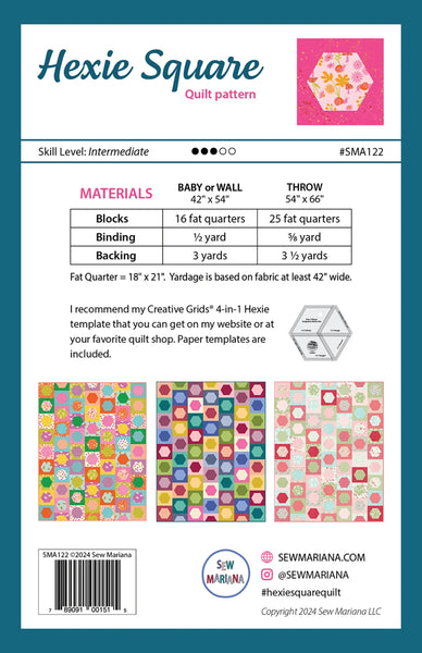 Hit the ground running with this geometric delight. Hexie Square invites quilters to step into the world of hexagons and make a mesmerizing early-intermediate quilt. It’s precut friendly, best used with fat quarters, and it has absolutely no tricky y-seams or paper piecing. Now, the 4-in-1-hexie ruler is highly recommended for this pattern, but it does include a paper template otherwise!